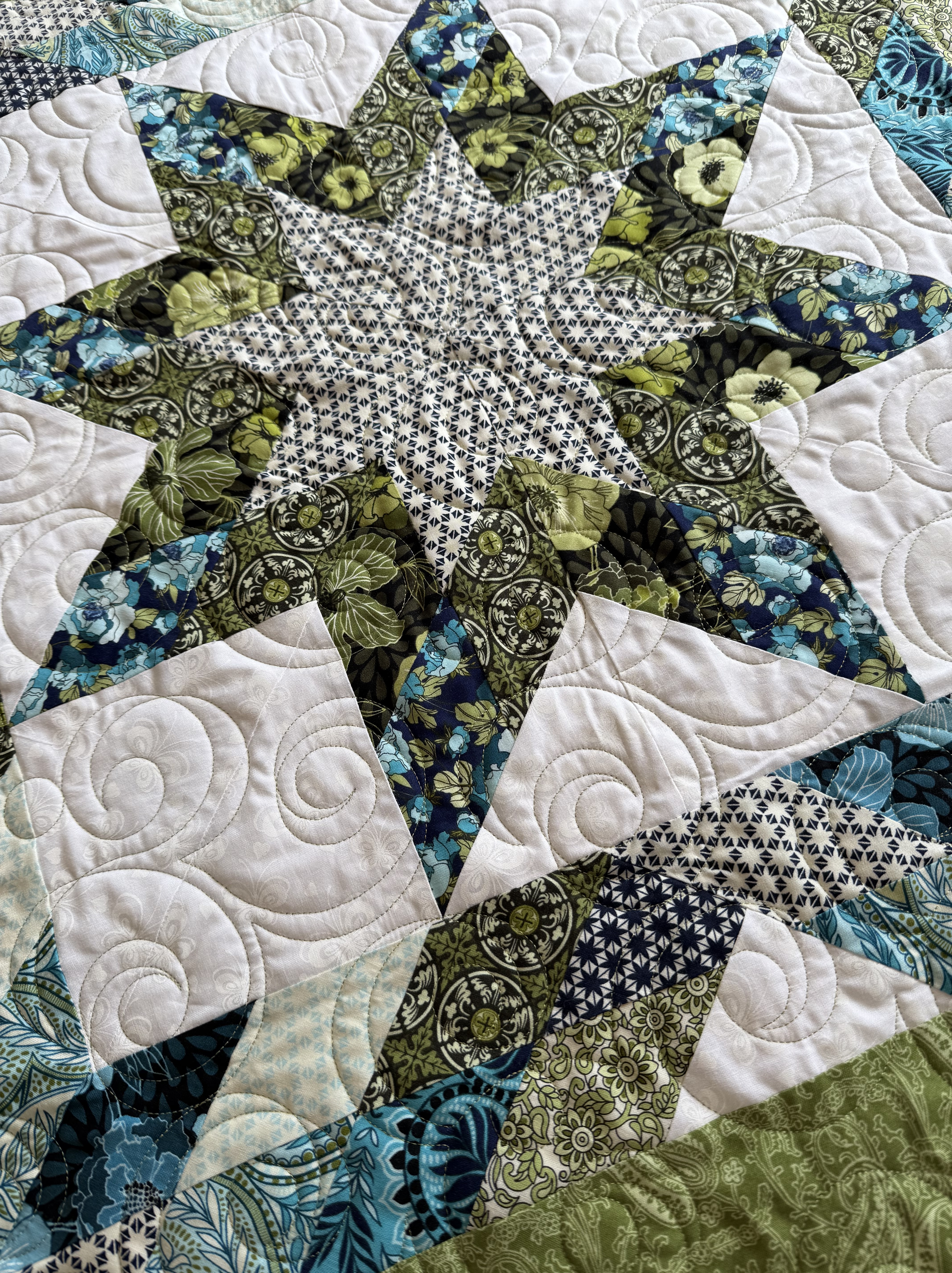 Quilting is completed with an APQS 12-foot longarm quilting machine, including the Intelliquilter computerized system for precision and quality. There are hundreds of designs and many thread “auditions” to choose what’s right for your quilt!